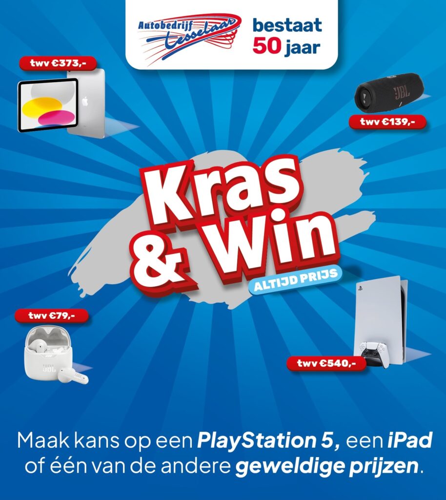 wasbeurt, tankbeurt van minimaal 20 liter en shopbesteding van €10 (tabak uitgesloten) ontvang je van ons een GRATIS kraskaart. Hiermee maak je kans op allemaal geweldige prijzen, zoals een PlayStation 5 en een iPad. En het mooiste van alles? Het is ALTIJD PRIJS!